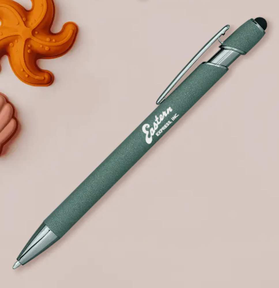Soft-touch, executive-style pen with gunmetal trim and a stylus. Black ink.